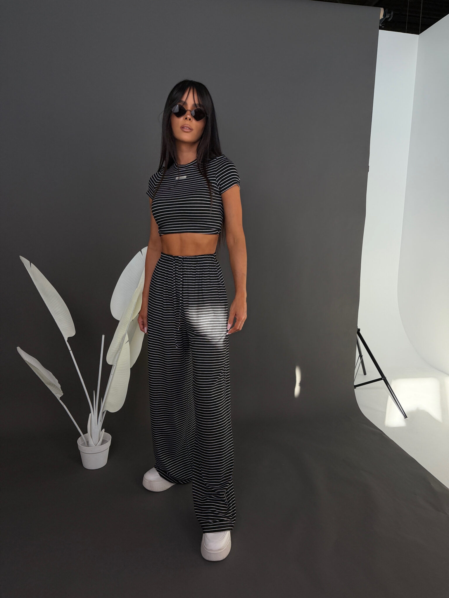 Komplet składający się z koszulowej bluzki bez rękawów i szortów z wysokim stanem. Góra zapinana na guziki, z klasycznym kołnierzykiem i kieszonką z haftem. Spodenki z elastyczną gumką w pasie, zapewniającą wygodę i dobre dopasowanie. Całość wykonana z lekkiego, oddychającego materiału o wyrazistym, abstrakcyjnym wzorze. Idealna propozycja na lato.Skład: 90% wiskoza 10% nylon